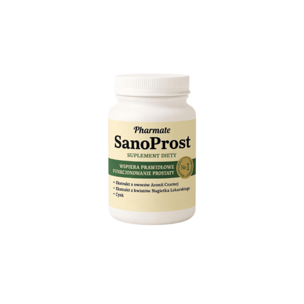 SanoProst to suplement diety dla mężczyzn, zawierający ekstrakt z aronii czarnej, nagietka lekarskiego, pestek winogron, cynk oraz witaminę C, przeznaczony do uzupełniania diety w składniki wspierające prawidłowe funkcjonowanie prostaty.